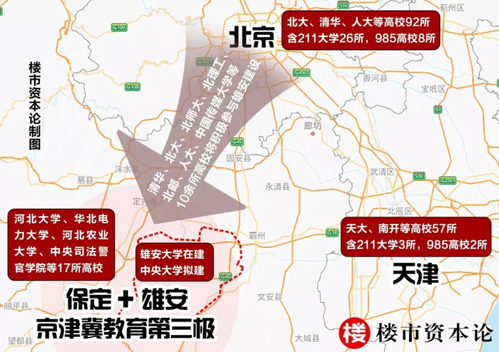 保定东部新城正联手雄安打造京津冀教育第三极,高素质人口也将进一步推动区域融合发展。保定除了现有的16座高校资源以外,也将享受距其30公里雄安新区引进的如北大、清华、人民大学的一流高教资源。这次京东智能城市项目建设的主要牵头方之一就是板块里的河北大学。