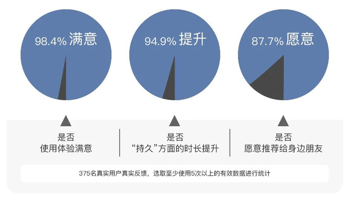 产品上市两个月后,超鸟公开招募粉丝进行反馈,根据使用情况与次数,筛选出375份有效数据,数据表明,有超过94.9%的粉丝亲测证实时长有提升,甚至有87.7%的粉丝表示愿意推荐身边的朋友购买!