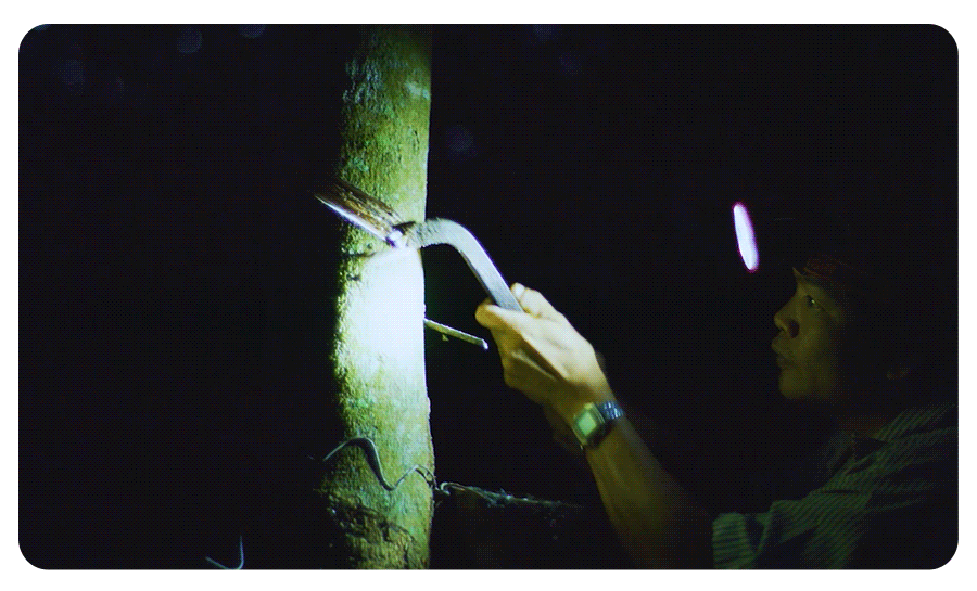 一颗乳胶树的生长要7年,能采集20年左右,这只套套选的是18-20岁的壮年乳胶树,还必须早上4:30割胶。