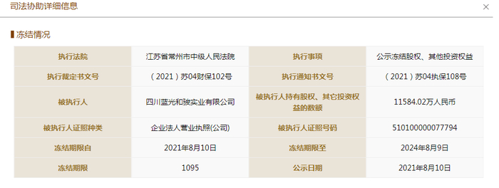 从国家企业信用信息公示系统,乐居财经获悉,江苏省常州市中级人民法院执行冻结了蓝光和骏在蓝光嘉宝持有的11584.02万元权益数额,冻结期限从2021年8月10日到2024年8月9日。