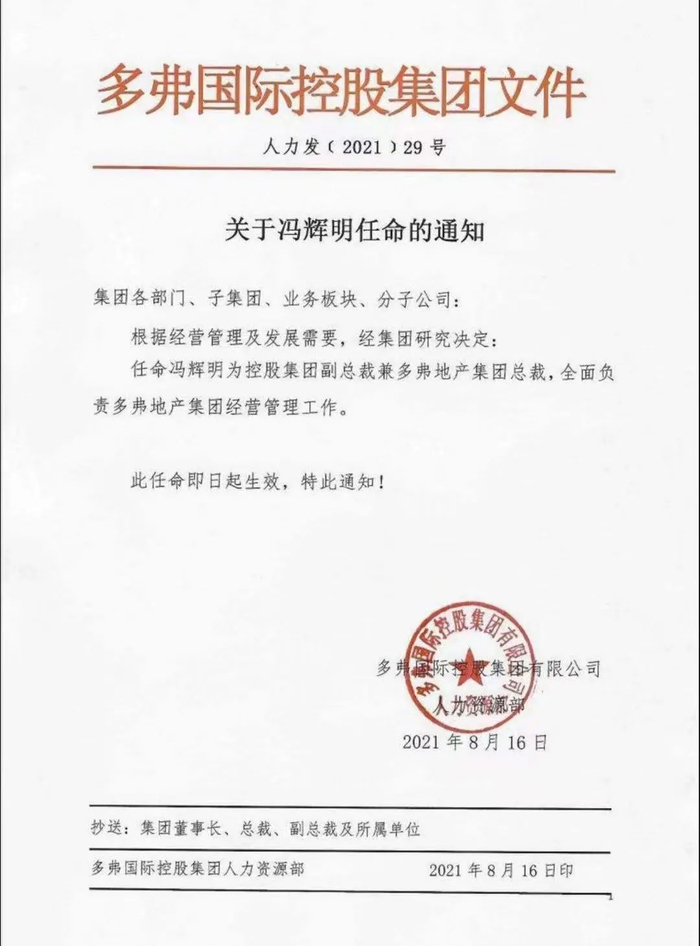 刚刚,艳姐独家获悉,于今年3月加盟三盛的冯辉明,已加盟多弗国际控股集团,担任总裁兼多弗地产集团总裁,全面负责多弗地产集团经营管理工作。