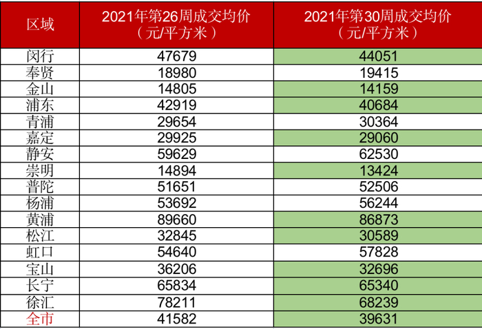 结果显示,全市来看,2021年26周上海全市商品房成交价为41582元/平方米,随着二手房“核定价”的发布,2021年30周上海全市商品房成交价降至39631元/平方米,一个月不到的时间就已跌去约2000元/平方米。