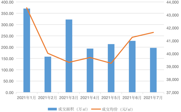 从成交数据来看,2021年7月,上海全市商品房成交面积196.7万平方米,同比下降17.68.环比下降13.7%,成交均价41644元/平方米,同比上涨3.72%,环比微增0.91%。