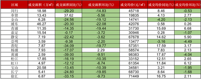 具体到区域来看,闵行、金山、浦东、静安、普陀、长宁同环比跌幅较大,而奉贤为上海唯一成交面积同比增长的区域。成交均价方面,金山、崇明出现同、环比下跌,闵行、嘉定、黄浦、宝山、长宁同比上涨,环比下跌。