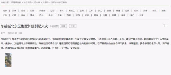 旭辉东樾城的违建已成为居民的一块心病,在沈阳市的政府留言板上,从年初至今已有至少六条留言涉及违建,多个部门作了回应,但违建仍在持续。