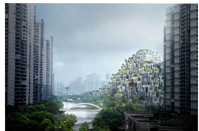 而在上海普陀区的苏州河畔,总用地面积为30公顷,其造型如同“两座郁郁葱葱的山丘”,由400级台阶形成的露台和1000根结构柱形成的树状柱台组成,是一个地形学建筑的大胆实践,这个项目叫1000trees。