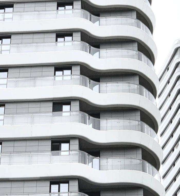 豪宅项目九庐的外立面运用了白色色调,采用西班牙进口陶板,波浪式异型为环廊,立体层次感较强。洁白优雅的造型极具现代建筑之美,同时极大保留了不同方向的观景需求。
