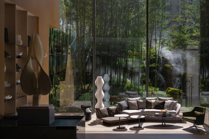 大多数豪宅的下沉庭院,主要承担会所的“采光井”功能,面积都不大。但崂山壹號院这个下沉庭院却有约600㎡,日式禅意园林的精髓在此体现的淋漓尽致,瀑布、假山、原生植被和浅池构成的自然空间,营造出了观瀑听鸟的灵动体验。