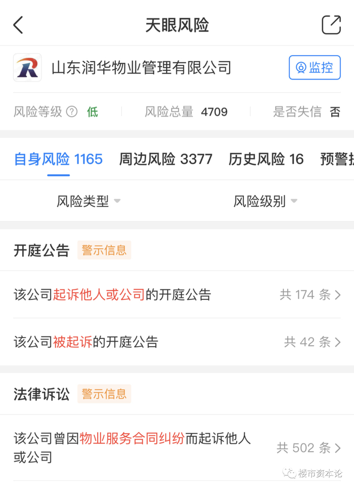 天眼查显示,润华物业自身司法风险就高达1165条之多,涉案案由为物业服务合同纠纷的案件最多。