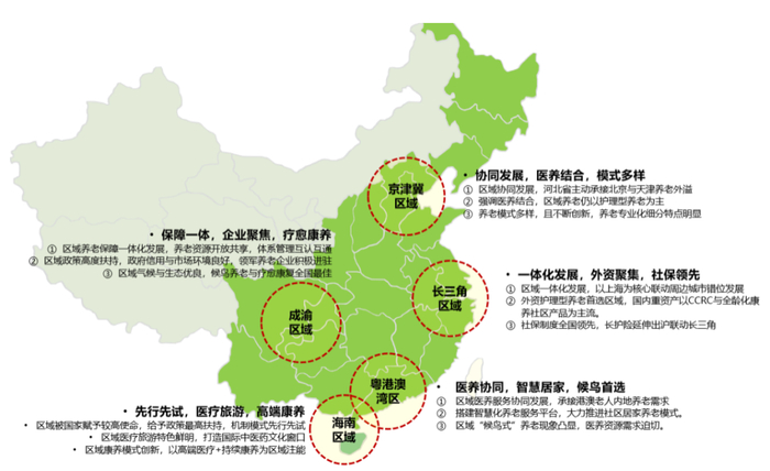 五大康养市场新格局,引领康养区域化快速发展。基于我国养老市场投资特征与其对人口、经济、消费、医疗、文化、环境及配套等资源特性,以及东西南北差异,五大区域为代表的康养市场发展格局加速形成——“京津冀区域、长三角区域、粤港澳区域、成渝区域、海南区域”,其区域性特征差异化鲜明。