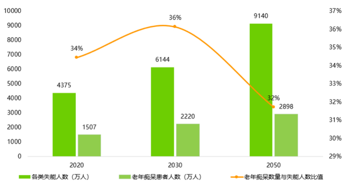 图:2020-2050年中国老年痴呆与失能半失能患者人数对比
