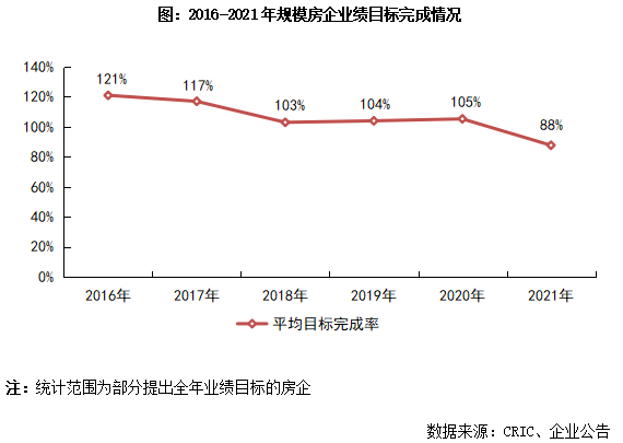 据克而瑞统计,不同于往年几乎都在105%以上的年度业绩目标完成率,在2021年,规模房企的平均目标完成率仅有不到90%。而包括头部们在内,披露过年度业绩目标的房企有超过八成没能完成。