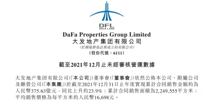 据大发地产官方披露,其2021年的完成的合同销售额共计375.63亿元。