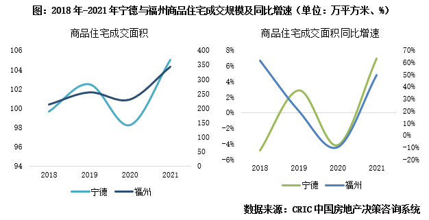 宁德楼市波动与福州高度正相关。从近4年商品住宅成交面积走势来看,尤其是2019年后随着福州逐步放宽落户和买房门槛,两市楼市冷热传导一致。2020年与2021年两市市场规模同步负增长和正增长。2021年福州“无门槛落户”刺激成交规模接近400万平方米,同时宁德全年成交面积突破100万平方米创新高,整体开盘去化率达95%。