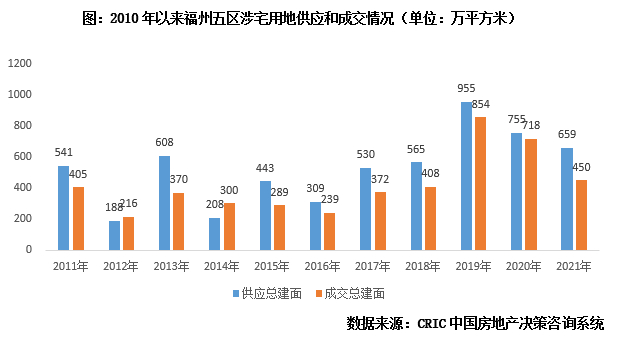 此外,值得引起高度关注的是,地方政府过于以来土地财政往往会带来供地过量,进而导致楼市供求关系失衡,库存高企等一系列问题。据CRIC监测数据,福州主城五区自2019年以来涉宅用地供地规模呈现“翻番”态势,由2018年的565万平方米上涨至955万平方米,以此带动整体成交规模稳中有增,2019年之后虽然逐年回落,但2021年涉宅用地成交规模依旧达到了450万平方米,远高于2018年水平。