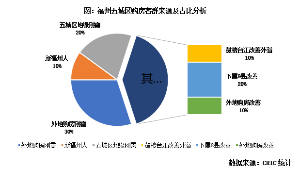 在占比和组成上,新福州人占五城区成交20%;本市改善购房者占比30%,由鼓楼和台江区外溢和下属8县两部分组成;外地购房者占比50%,其中外地刚需购房者占比40%。