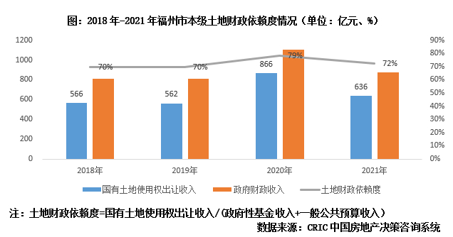目前来看,福州经济发展的主要问题在于土地财政依赖度相对较高:2020年福州市本级国有土地使用权出让收入已高达866亿元,土地财政依赖度一度攀升至79%,2021年随着拍地收入的减少而略有回落,但仍高达72%,属2018年以来的次新高水平。