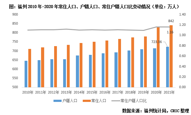 目前来看,福州楼市在2021年创成交新高,整体走势呈现出“先热后冷”,与全国整体行情匹配,上半年放量主要与2020年末全面放开落户密切相关,外围郊县部分此前受限于政策、购买力尚可的刚需和改善的客户购房需求得以稳步释放,从常住人口和户籍人口变动情况我们也不难看出端倪,2020年之前常住人口和户籍人口年增量基本不超过10万人,二者差额也相对恒定,保持在70万人左右,而2020年末伴随着福州全面放开落户,常住人口也出现了显著攀升,2020年-2021年年增量均值达到31万人,常住户籍人口比也增至1.16。