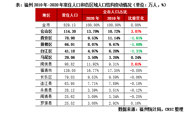 而从福州统计局发布的2020年人口普查数据来看,主城五区人口绝对量虽有增长,但整体占比下降1.21个百分点却是不争的事实:五区中仅仓山区上升了3.07个百分点,常住人口增量在各区域中居首,马尾区2020年占比基本与2010年持平,而晋安区、鼓楼区、台江区占比均出现了不同程度的下降;值得关注的是,另一常住人口占比增长显著的区域为闽侯,2020年较2010年占比上升2.61个百分点,仅次于仓山,事实上,闽侯虽地处福州中心城区外围,但因大学城教育配套、地铁交通配套日趋完善,加之房价相对“亲民”,也吸引了很多年轻人到闽侯买房居住。