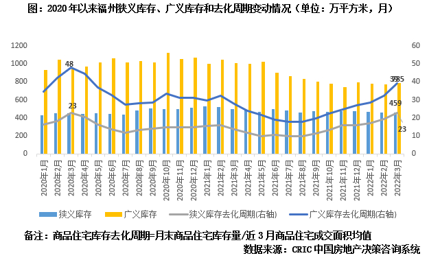而判断供地是否过量的一个重要标准便是该城市的库存变动情况,据CRIC监测,虽然自2020年以来福州的广狭义库存均呈现稳中有降态势,但是因2021年下半年整体成交热度回落,导致广狭义去化周期开启上行模式,至2022年3月末分别达到39个月和23个月,库存积压问题开始显现。