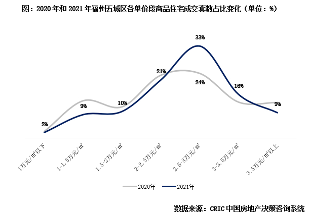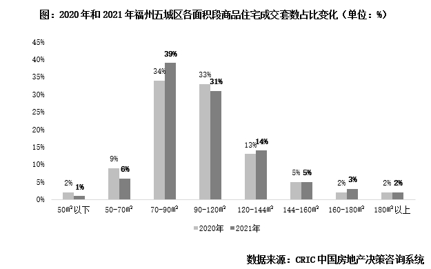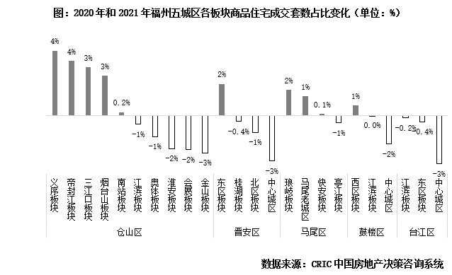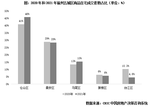 区域变化上,由主城向外围转移。对比2020年和2021年(下同)各区域商品住宅成交套数,仓山区占比46%最高,晋安区28%次之;马尾区占比上升2pcts,台江区和鼓楼区市占比重下降。