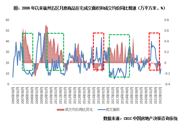 结合福州商品住宅成交面积和成交均价同比变动来看,负相关关系更为显著。2015年1月-2016年2月,2021年6月至2020年12月福州房价均迎来较长时间回落,同比由正转负最大降幅达15%,相对应的,商品住宅月成交面积适时由底部快速回升,在房价同比负增长期间纷纷进入规模上行期。与之形成鲜明对比的是,2017年6月-2008年9月,2010年5月-2012年1月,2016年8月-2018年9月福州房价同比大增,成交面积皆在低位徘徊,居民观望情绪明显加重。