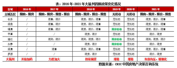 纵观福州2016年以来调控变动情况,自2016年五区限购、限贷加码以来,整体从严:2016-2018年处于政策“高压期”;2019-2020年整体维稳,2019年部分福州下辖县市限价有局部松动,2020年因新冠疫情影响,年末福州全面放开落户,但整体政策以稳为主。2021年延续稳字当头主基调,有保有压,调控日益精细化。