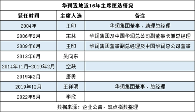 华润置地北京于2002年更名“华润置地有限公司”,在规模逐步扩大的同时,一把手人员也陆续更迭。观点新媒体不完全统计,从2004年至今,该公司董事会主席已更换了6位(王印兼任两次),任职最长4年,最短则仅有10个月左右。
