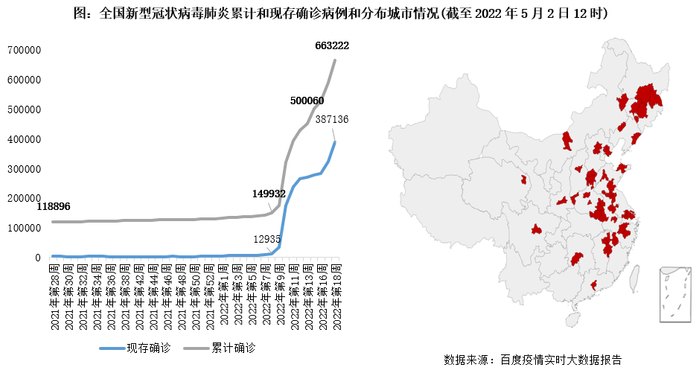 截止至2022年5月1日,全国累计报告新型冠状病毒肺炎确诊病例66万例,较年初增加53万例,现存确诊病例39万例。全国超过38个城市发布“静态管理”疫情防控通告。其中上海、上饶、哈尔滨等仍处在局部或全域静态管控中。西宁、唐山、芜湖、西安等虽已解除区域静态管理,但宏观经济运行遭遇了长时间静止。如长春连续“静态管理”达48天。