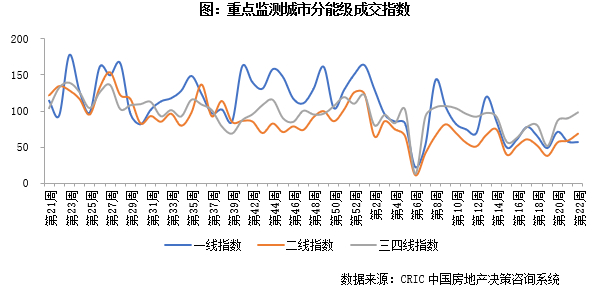 2022年第22周成交整体回升。一线城市成交指数为57.07,环比微降0.62点;二线城市成交指数为68.83,环比增长9.70点;三四线城市成交指数为97.77,环比增长8.25点。