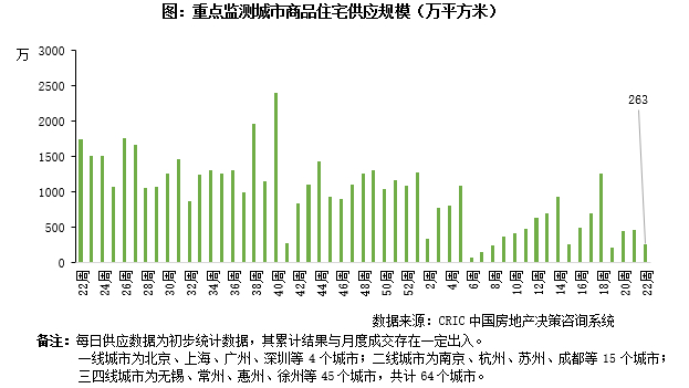 2022年第22周,全国重点城市共取得预售证面积263万平方米,环比下降44%。
