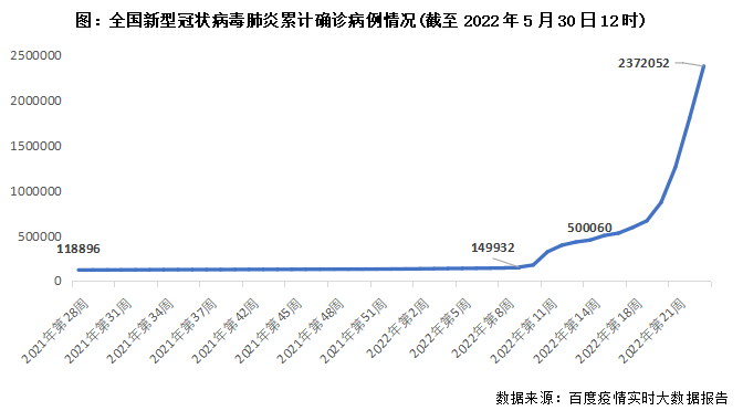 截止至2022年5月29日,全国报告累计新型冠状病毒肺炎确诊病例2372052例,其中,上海本周新增确诊274例,北京本周新增确诊184例。