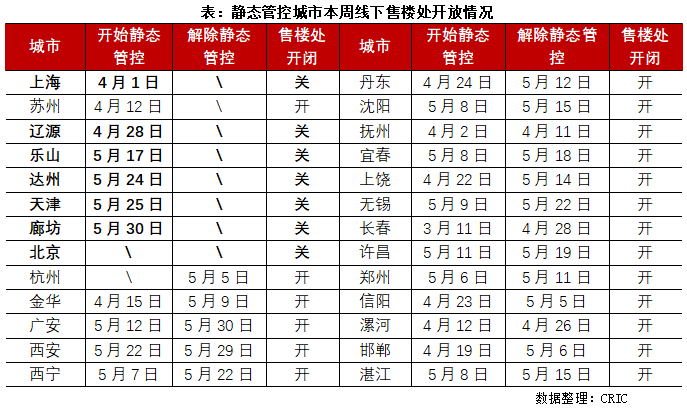 CRIC调研数据显示,静态封控城市中,仅有7个城市线下售楼处处在关闭状态。尚未解除静态管控的城市中,上海、达州等多数城市营销中心都暂未对外开放。