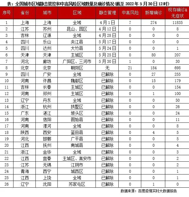 近期,全国26个城市发布“静态管理”疫情防控通告。其中广安、许昌等已解除区域静态管理,上海、北京、达州等仍处在局部或全域静态管控中。本周,达州大竹县、天津主城等开始实行区域静态管控。