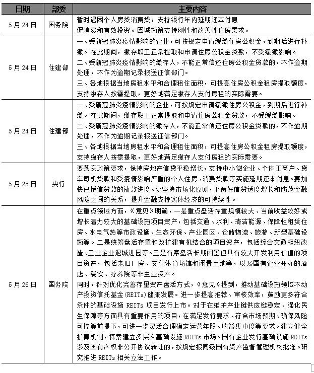 第22周,中央及地方出台一系列稳增长、调控松绑、支持复工复产政策。