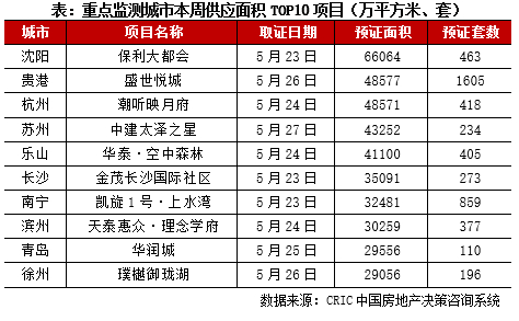 2022年第22周,重点城市供应面积TOP10项目中,三四线城市项目入围数量增多,比如贵港、乐山、徐州等。沈阳保利大都会总供应面积6.6万平方米,摘得面积榜冠军。