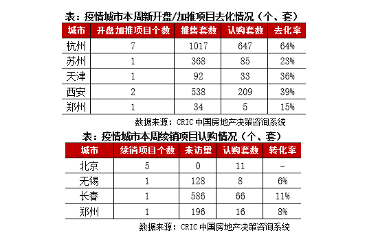 聚焦受疫情影响城市楼市表现,本周5个重点监测城市共开盘加推12个项目,平均开盘去化率约为41%,略低于无疫情城市平均去化率。从续销项目认购表现来看,北京监测项目受到疫情影响,到访量依然为零,认购量也低位运行,无锡、郑州转化率低至10%以下。