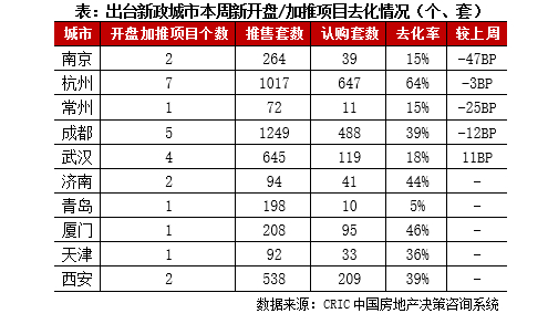 聚焦近期政策松绑城市的房地产市场表现,10个重点监测城市共计开盘加推26个项目,平均开盘去化率约为39%。其中,武汉去化率回升至18%,较上周提升11个百分点,但仍处在低位,南京受结构性因素影响去化率大幅回落,杭州新政后房企推盘积极性提升,加推项目个数增加,且不乏优质项目入市,半数以上项目实现开盘即罄。