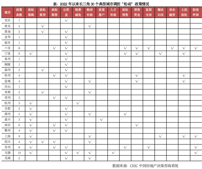 因此前长三角市场热度一直较高,因而也成为楼市调控的重点区域,30个典型城市中有20余个出台了不同程度的楼市紧缩性政策,具体来看: