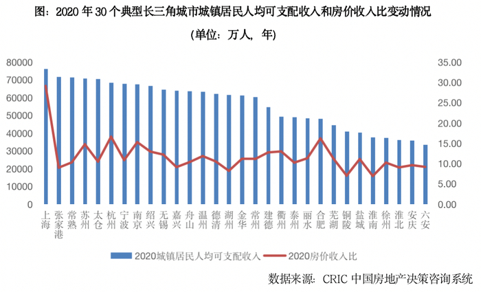 而从购房难度来看,除了上海房价高企,2020年房价收入比近30年,杭州、合肥、南京作为第二梯队,基本持稳在15-16年,余下城市购房难度相对适中,苏州、衢州、绍兴、无锡、温州等18城房价收入比维持在10-15年左右,淮南、铜陵等购房基本无压力,房价收入比均在8年以下。