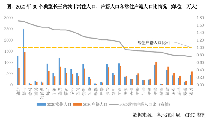 纵观30个典型城市2020年常住人口情况,上海、苏州、杭州绝对量靠前,均突破1000万人,温州、宁波、合肥、南京、徐州次之,常住人口也达到了900万人以上,人口优势显著,而从人口流入流出情况来看,30城中有18城常住户籍人口比大于1,属于人口净流入城市。