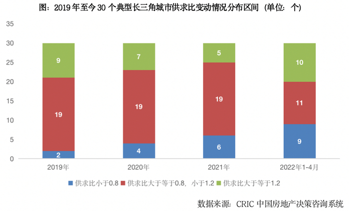 纵观30个典型城市2019年以来供求比变化,总体呈现出以下几大特征:一是多数城市供求持稳(供求比大于等于0.8,小于1.2),并无明显供应过量情况;二是因2022年行情转淡叠加新冠疫情不确定影响,供过于求(供求比大于1.2)城市个数达到了10个;三是供不应求(供求比小于0.8)城市个数稳步上升,2022年依旧达到了9个,占比约1/3。