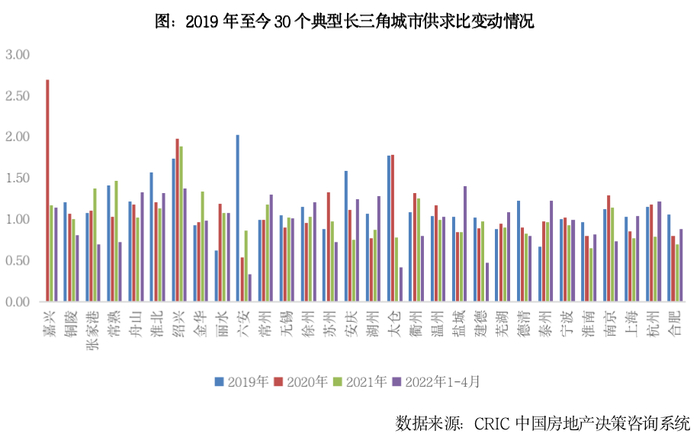 分城市来看,上海、杭州、南京、盐城、淮南、芜湖、宁波、徐州、湖州、建德、苏州、温州、无锡、常州等基本保持供求持稳,2019年以来多数年份供求比维持在0.8-1.2之间波动,上海、杭州等购买力相对充裕的城市基本属于供应主导型市场,少数市场大热年份也会出现供不应求情况,与之形成鲜明对比的是,铜陵、张家港、舟山、常熟、绍兴、衢州多数年份供求比基本在1以上,其中绍兴2019-2020年3年供求比基本都在1.5以上,供过于求的情况较为严重,值得关注的是,部分城市诸如太仓、淮北等前期供应过量城市,2021年以来政府也在不断调整供应节奏,整体供求比呈现出稳步下行趋势,库存积压的情况有了明显缓解,去库存效果初显。