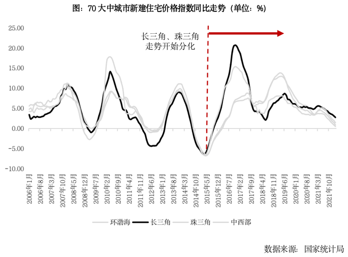 通过回顾近20年以来统计局发布的全国各地区新建住宅价格指数同比走势可以看到,2015年起各地区新房市场由统一走向分化。即:在同一楼市周期内,长三角地区相比于其他地区,往往启动时间更早、调整波动更大。