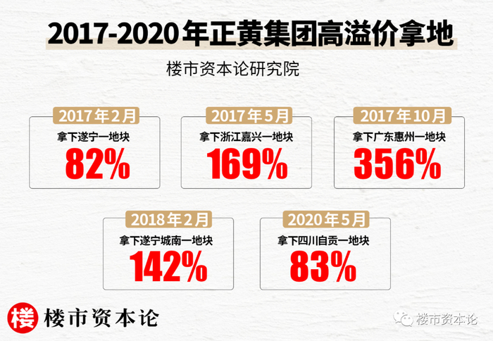 2020年5月,正黄集团以1.46亿总价拿下四川自贡一地块,溢价率高达83%;2018年2月,在大本营遂宁城南,拿下一地块溢价率为142%;2017年2月、5月、10月,在遂宁、浙江嘉兴、广东惠州拿地溢价率更是高达82%、169%和罕见的356%。