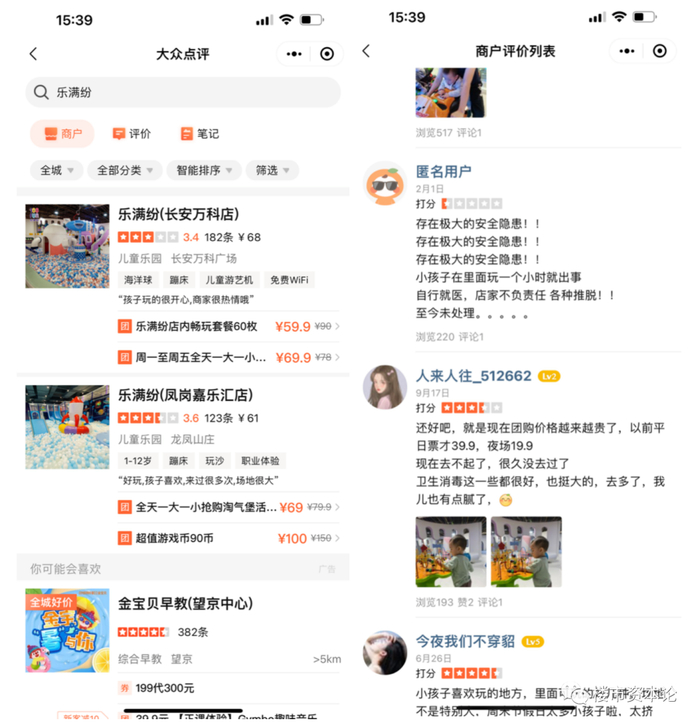 2019年、2020年,满屋世界还在东莞先后开设了两家,名叫乐满纷的室内儿童乐园。但从大众点评来看,这两家店评分不高,都在3分左右,并且其中有多条差评显示,儿童在其中玩乐时存在安全隐患,并且店家各种推脱拒绝处理。