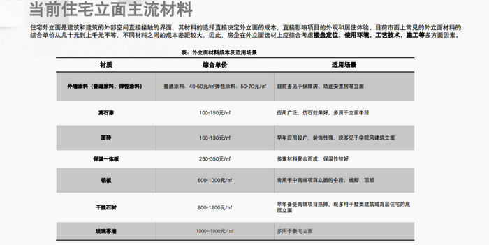 不同材料之间成本差距较大,房企在外立面选材上应综合考虑楼盘定位、使用环境、工艺技术、施工等多方面因素。