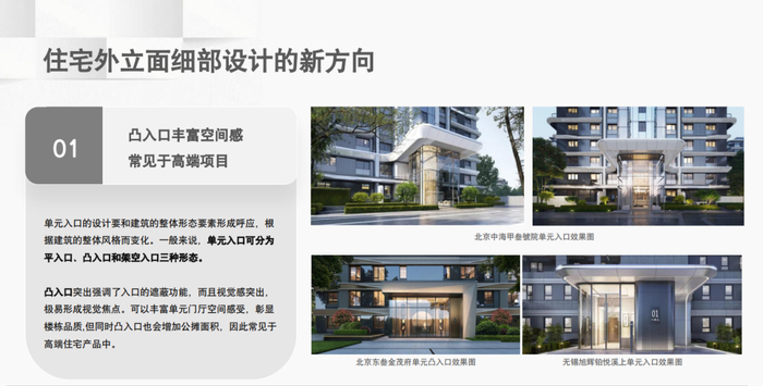 一般来说,单元入口可分为平入口、凸入口和架空入口三种形态。凸入口突出强调了入口的遮蔽功能,而且视觉感突出,极易形成视觉焦点。可以丰富单元门厅空间感受,彰显楼栋品质。但同时凸入口也会增加公摊面积,因此,常见于高端住宅产品中。如北京中海甲叁號院单元入口为凸入口设计。