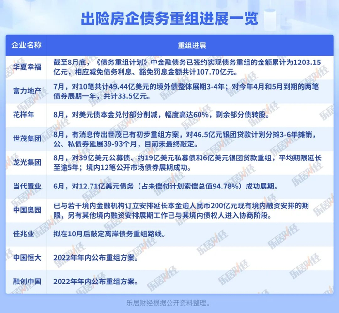 债务违约发生后,已有包括恒大、融创、世茂、龙光、华夏幸福等在内的多家房企走上了重组之路。截至目前,部分出险房企在债务重组上取得了实质性进展。