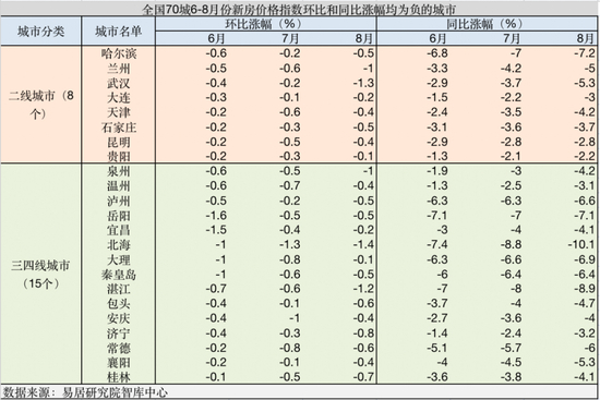 全国70城6~8月新房价格指数环比和同比涨幅均为负的城市。来源:易居研究院智库中心